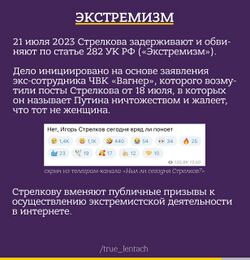 Игорь Стрелков, он же Гиркин, он же С.Рунов — вечный нытик по поводу Специальной Военной Обсирации, основатель Клуба Разорванных Пердаков Рассерженных Патриотов. Считает, что война почему-то идёт не по плану, клянчит очередную волну мобилизации вместе с военным положением. Периодически срётся с Пригожиным и занимается неприкрытой дискредитацией минобороны, овбиняя последнюю в недостаточном людоедстве и избыточном воровстве. По причине выполнения функции громоотвода жопной боли самых оzлобленных поцреотов, очень долго не был набутылен за такаую-то дискредитацию, а боевой опыт, видимо, хранит от получения своей личной статуэтки с приглашением на концерт Кобзона. После вагнеровского бунта (заявленные цели которого 1:1 ложились на критику Гиркина) скользкий Пригожин как-то отпетлял, никого из активных участников мятежа не задержали и все делопроизводства отменили. По старой русской традиции - виноватых наградили, а непричастных наказали и 21 июля 2022 против Стрелкова таки выдвинуто обвинение по статье 282 УК РФ (экстремизм), а в его квартире прошёл обыск. 25 января 2024 Гиркина приговорили к 4 годам колонии общего режима за «публичные призывы к экстремизму с использованием интернета» (ч. 2 ст. 280 УК РФ). F.