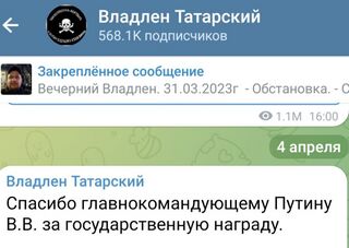 Владлен Татарский aka Вафлен Пельменский — в миру Максим Фомин. Судимый за ограбления банков при Януковиче бандит из Украины, пошедший со всеми Кивами и титушками косплеить «рабочих и шахтёров против нацистского режима Киева» на довольствии у Кремля. Бегать с винтовкой по окопам ему стало западло, и он пошёл в пиздящие головы низовых пропагандонов. Из массы себе подобных выделяется одним из самых крупных, — если не самым крупным, — z-каналом в телеграме и публикацией кадров с мест боевых действий. Сам по себе Вафлен являлся классической шавкой режима, полностью покорный госповестки, следовательно, не особо интересный за пределами его z-секты. Также публиковался в черносотенном книжном магазине с символичным названием «Листва».