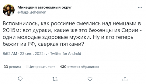 22-ого прошли малочисленные протесты, в основном в городах-миллионниках и в основном при участии баб. что неудивительно, ибо после того как их всех закатали в автозаки - мужикам повестки затолкали шваброй в жопы и отправили прямо из обезьянника на сборпункты. Гораздо более многочисленные демарши случились на границах РФ, где километровые колонны машин выстроились на выезд Финляндию, Казахстан и даже Монголию. Сраные гастарбайтерские чуркистаны и гейропы вдруг стали не таким зашкваром для гордого русича. А 23-его унылое быдло с диким бадуном и вещмешками уже грузилось в мясовозки. Не вышел русский бунт и тут, хотя его пророчили как раз при случае мобилизации.