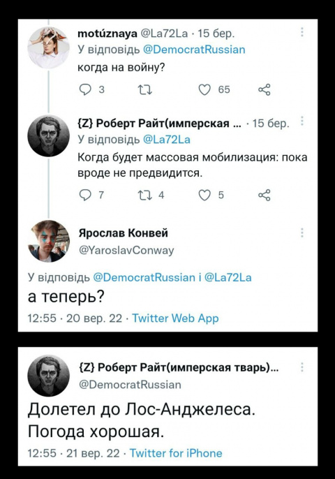 === 99% === | 21-ого сентября 2022, незадолго после харьковского наступления ВСУ случилось то, чего так долго, с замиранием сфинктера, ждали все z-поцреоты и диванные воины РФ. Была объявлена мобилизация. Но такая, маленькая, частичная, на пол-шишечки. Согласно указу, но вопреки слову ц-ря о том, что СВО будет вестись исключительно силами контрактников, в окопы следует загнать 300 000 резервистов. Однако ничего из текста указа не указывает на частичность, ибо никаких ограничений ни по возрасту, ни по физ- или профгодности, нет. Всё это было на словах от чинуш и министров. Так и вышло - хватать стали всех, до кого дотянуться. Больных, старых, студентов с отсрочкой и даже не служивших (то бишь нихера не резервистов). | ||